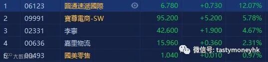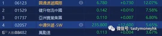 由于「双十一」,快件量预计仍将延续大幅增长态势,全行业将面临空前的压力和挑战。物流股是第一批受惠的股份,圆通速递国际(06123.HK)升12%,收市报6.78元。中通快递(02057.HK)升5.65%,收市报235.8元。