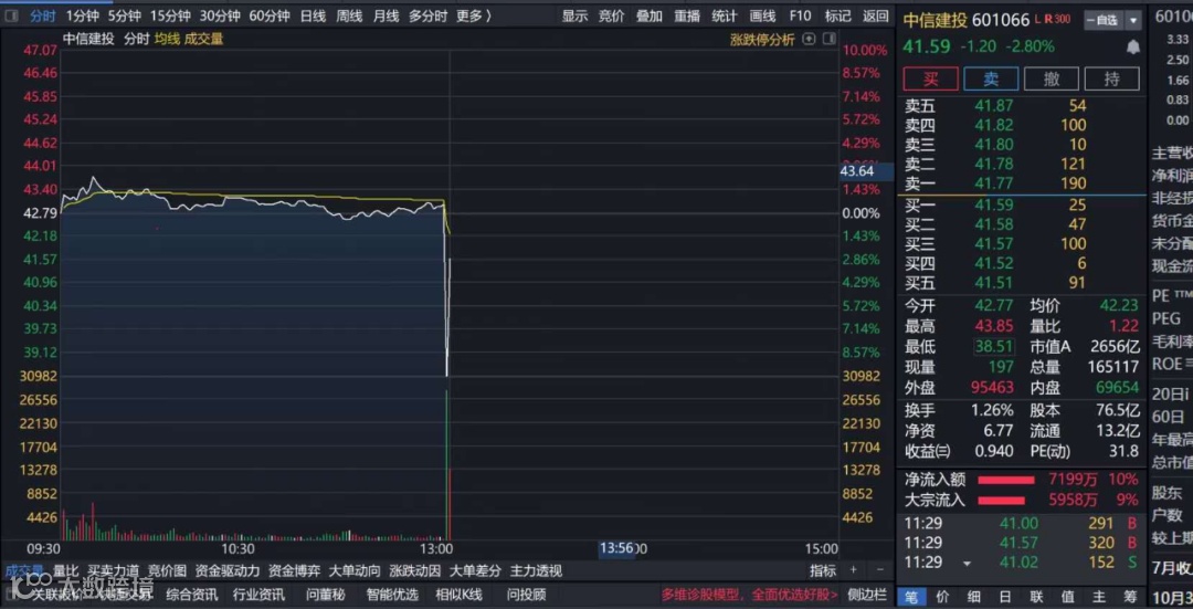 11月2日,3000亿券商龙头之一,股价平稳运行的中信建投临近午盘突发跌停,然而仅仅是一瞬间,该股又重新拉回,截至午间收盘,中信建投收跌2.8%,半日成交额6.88亿元。在中信建投一度闪崩触及跌停的那一分钟,成交3406500股,成交金额1.31亿元,折合成交均价38.46元/股。