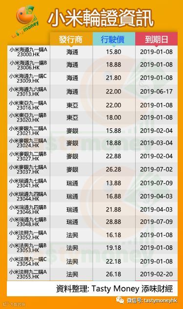 首日小米轮证发行商有五家, 分别是法兴丶瑞万通博丶海通丶麦银丶东亚。行驶价由13.88至28.88元, 换股比率全是10兑1, 到期日由2019年1月8日至2019年7月9日不等。
