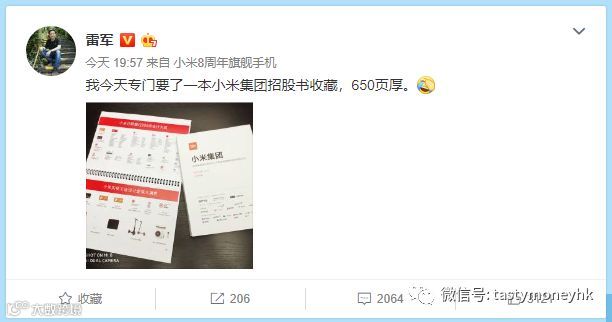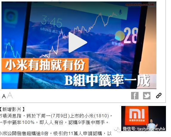 市场消息指,将於下周一(7月9日)上市的小米(1810),一手中签率100%,即人人有份,认购9手获中两手。