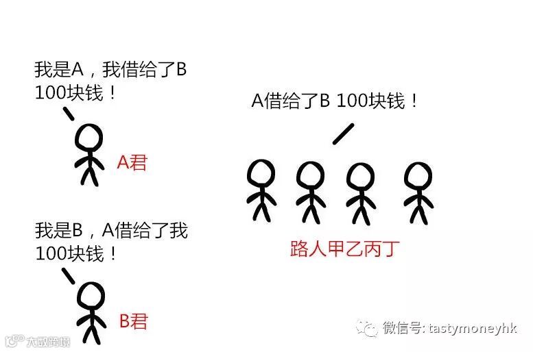 我们先来建立一个去中心化的系统,为了方便理解,我们来看一个简单的去中心化借贷模型:如果A借了B 100块钱,这个时候,A在人群中大喊“我是A,我借给了B 100块钱!”,B也在人群中大喊“我是B,A借给了我100块钱!”,此时路人甲乙丙丁都听到了这些消息,因此所有人都在心中默默记下了“A借给了B100块钱”。你看,这个时候一个去中心化的系统就建立起来了,这个系统中不需要银行,也不需要借贷协议和收据,严格来说,甚至不需要人与人长久的信任关系(比如B突然又改口说“我不欠A钱!”,这个时候人民群众就会站出来说“不对,我的小本本上记录了你某天借了A100块钱!”)。