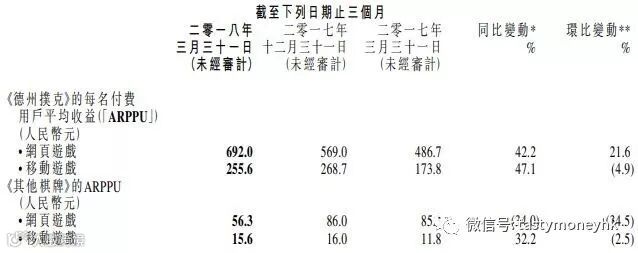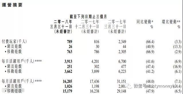 图片显示2018年第一季,付费玩家同比下降66.4%,每日活跃用户同比下降41.6%、每月活跃用户同比下降48%,三个重要指标下跌幅度非常大。可见玩家和付费玩家皆有流失迹象,对手游而言是非常致命的。小编认为唯一乐观的是,《德州扑克》的每名付费用户平均收益(ARPPU)提升,移动游戏中同比增长47%。