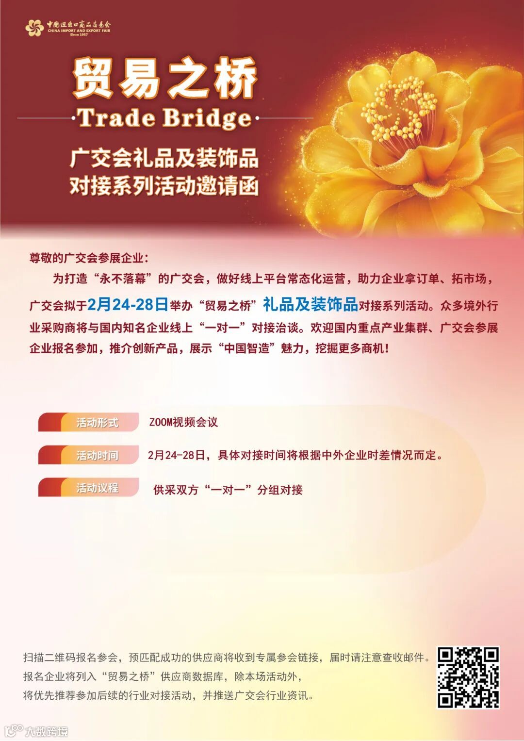 欢迎广交会参展企业报名参加,推介创新产品,挖掘更多订单。请感兴趣的企业,扫描活动海报上的二维码或点击报名链接进行报名参会,预匹配成功的供应商将收到专属参会链接。报名企业将列入“贸易之桥”供应商数据库,除本场活动外将优先推荐参加后续关于礼品及装饰品的对接活动,并推送广交会行业资讯。