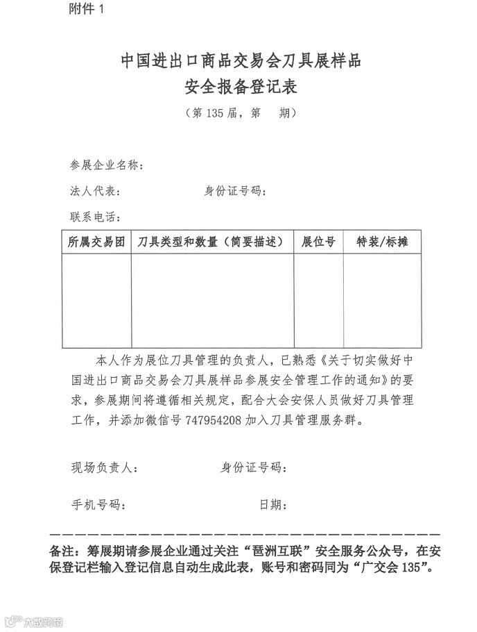 二、参展之前,刀具类参展企业须如实填报《广交会刀具展样品报备登记表》。请参展企业尽量采用替代品或图片、视频等展示,减少实物刀具数量。