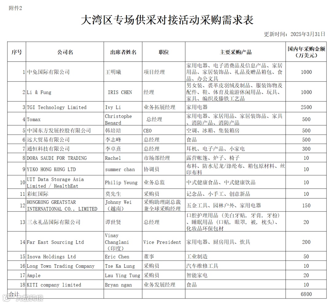 截至3 月31 日,活动已有18 家采购商报名,意向采购金额6,800 万美元(采购需求表详见下方附件2)。现诚挚邀请符合采购品类的广交会参展商报名参与本场活动。我们将优先选择已购买线上平台服务套餐的参展商,并结合采购商的筛选情况确定参会名单。同时,我们将为无第一期参展证件的参会企业提供免费办证额度。