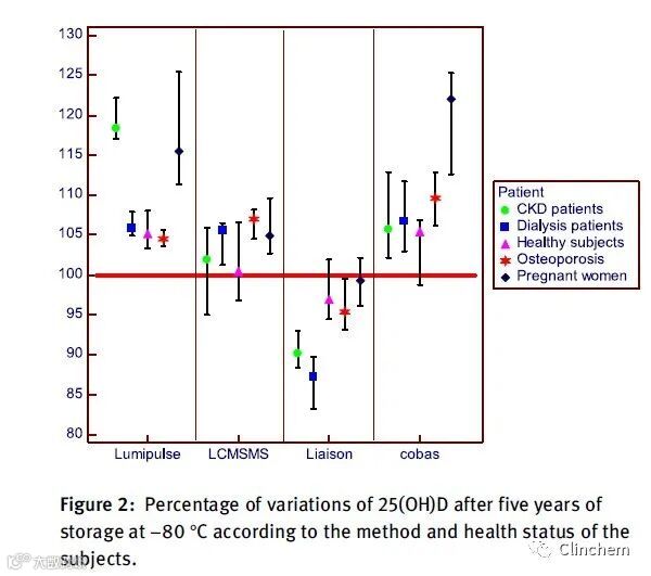 如下图所示:四种分析方法中,有三种的结果居然是增高的,也就是说:这个维生素D放着放着还越放越高了,但Liaison这种方法测得的结果却是降低的。此外,质谱法的稳定性要稍微好点,变化也就5%左右。这说明,所谓稳定性,还和检测方法有关。需要说的是:作者稍微有点失误的地方是这张盒式图的上下两根横线到底是表示四分位间距还是95%可信区间,作者没在Figure legend中说,推测应该是后者。此外,Y轴没有进行标识,但按照常理能推测出应该是变化幅度。