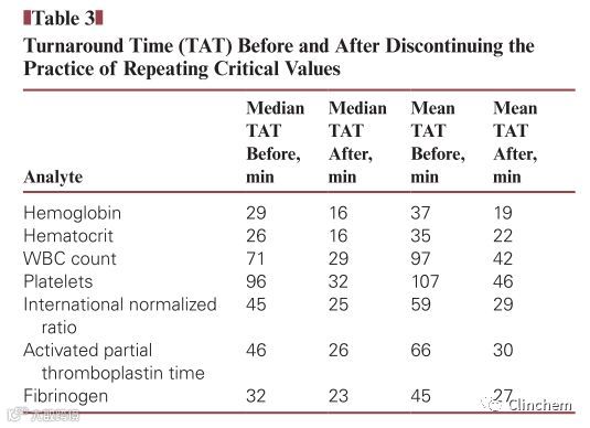 那么,危急值复查是否有坏处呢?在危急值复查制度执行了一个月之后,研究者中止了这项制度。也就是说,所有的危急值都不用复查了。对比危急值复查中止前后的TAT,研究者发现,危急值复查会导致TAT延长,时间在10分钟至1小时内不等。
