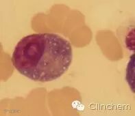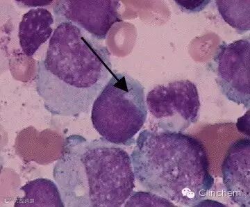 【王宏分析】具有代表性的几种骨髓瘤细胞形态:A--Mott细胞(胞浆中含有许多Russell小体。Russell小体在染色中有时会溶解,以致形成空泡);B---大而明显的核仁;C---火焰状细胞(浆细胞内沉积了一些无定形沉淀物,并常染成红色,故名。现已知沉积物也是免疫球蛋白,且多见于IgA型多发性骨髓瘤);D---胞浆中大量紫红色结晶体;E---Dutcher小体(核内包涵体)。