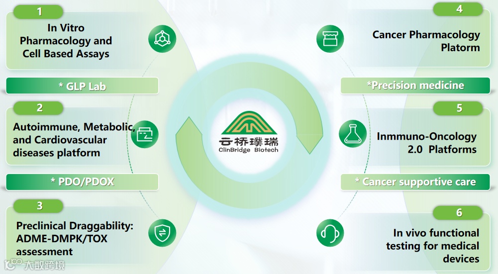 云桥璞瑞生物科技有限公司(ClinBridge Biotech Co. Ltd.) 是专注于创新药械行业内临床前研究快速发展的技术平台型企业。公司秉承‘只有通过高度临床相关的疾病模型才能提高临床转化率’的理念,系统建立与患者病理微环境更相关体内外模型和测试系统, 打造肿瘤药理、肿瘤免疫和自身免疫疾病等领域内具有差异化的核心技术,协同解决行业的痛点。同时,公司拥有配套的常规创新药械生物功能和安全性评价综合型平台,为合作伙伴提供全链条临床前解决方案。