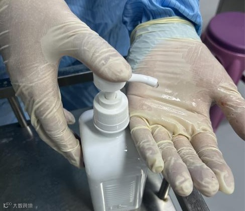 动物备皮完成后,兽医师使用速干手部消毒液对手部进行卫生手消毒,以减少手部暂居菌的过程。完成后,对穿刺部位进行消毒。首先使用碘伏棉球由穿刺中心向外周擦拭后,至少顺时针、逆时针各一次。后使用75%酒精棉球进行脱碘,待其自然干燥。(特殊部位的消毒,如巴马小型猪耳缘静脉穿刺,如血管周围有耳标覆盖,需连同耳标一同消毒)。穿刺部位消毒后,取用留置针前,兽医师再次使用使用速干手部消毒液对手部进行卫生手消毒,准备进行穿刺操作。