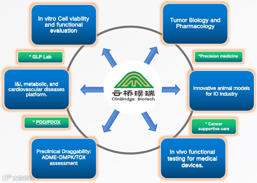 云桥璞瑞⽣物科技有限公司(ClinBridge Biotech Co. Ltd.) 是专注于创新药械行业内临床前研究快速发展的技术平台型企业。公司秉承‘只有通过高度临床相关的疾病模型才能提高临床转化率’的理念,系统建立与患者病理微环境更相关体内外模型和测试系统, 打造肿瘤药理、肿瘤免疫和自身免疫疾病等领域内具有差异化的核心技术,协同解决行业的痛点。同时,公司拥有配套的常规创新药械生物功能和安全性评价综合型平台,为合作伙伴提供全链条临床前解决方案。公司在国内多地设立实验和办公场所,具有配套齐全的体、内外实验室,包括分子生物、细胞生物、生物分析、生物标记物、多维度动物影像中心和具有AAALAC完全认证的实验动物中心。云桥璞瑞以全新的模式动物理念、完善的设施、升级迭代的疾病动物模型、多模态的影像技术和近十年的临床前技术积累,为国内外生物医药企业和研发机构提供全方位的临床前专业化服务,助⼒创新药械临床试验申报和转化。
