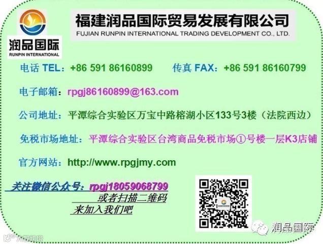 本公司主要经营台湾商品批发,欢迎各经销商、进品食品贸易商、进口连锁店、进口食品电商等来润品国际订货选购,订货电话:18059068799。 官网地址:http://www.fjrpgj.com/index.asp