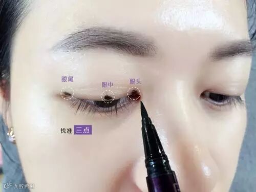 Step 3 :准备动作完成后,眼线分3部来描画,首先可以在画之前对着镜子找出眼睛眼头、眼中和眼尾的位置,找准图中标出的3点,分别用眼线笔点出眼头、眼中以及眼尾的位置。