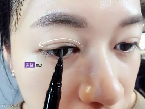 Step 5 :平行之后,然后开始从眼头的位置连接眼中、眼尾3点,继而画出一条对称且顺畅的眼线。