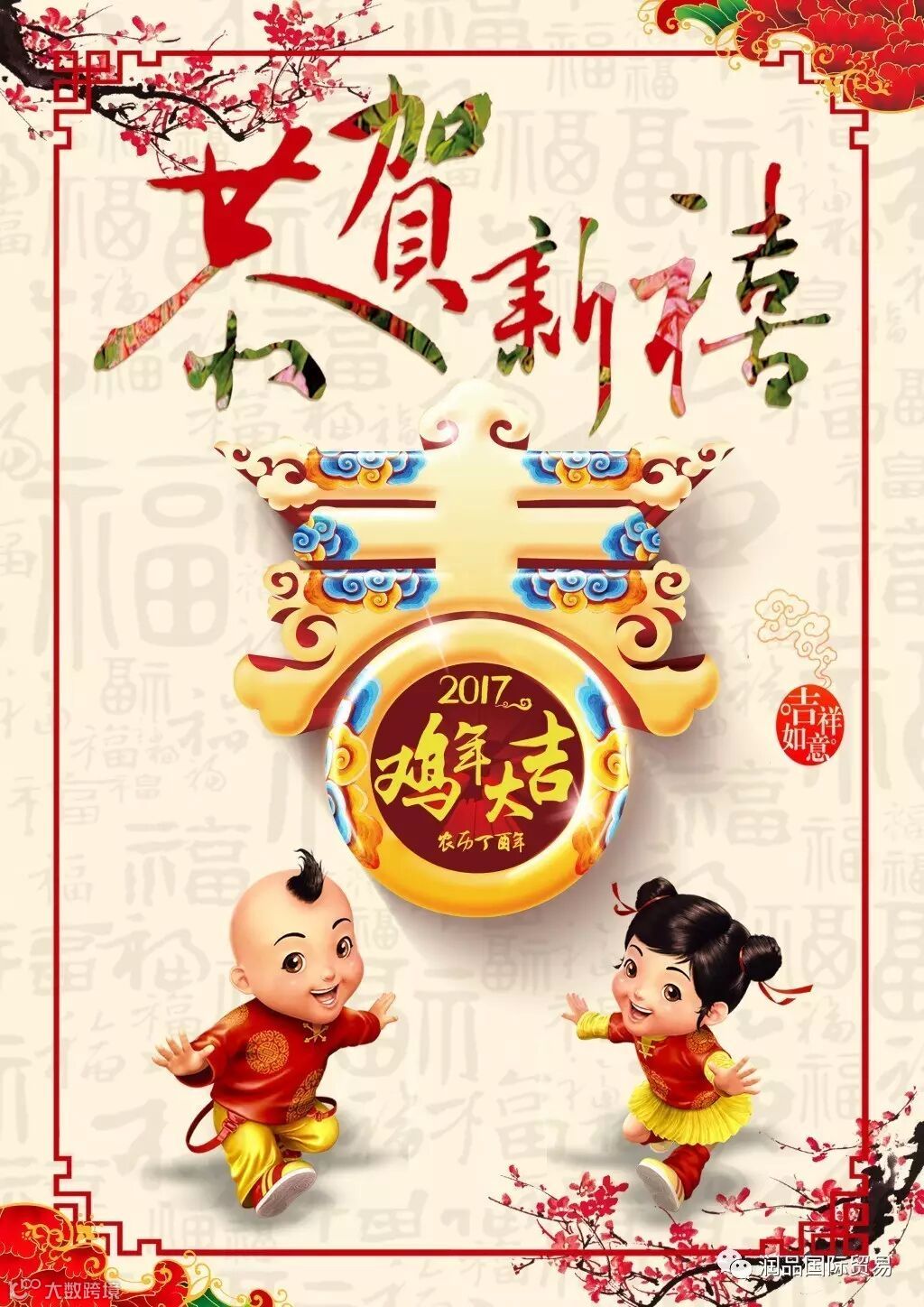 再次感谢您对福建润品国际贸易发展有限公司的大力支持。最后,衷心祝福您及家人新年快乐,鸡年吉祥,身体健康,阖家幸福,万事如意!
