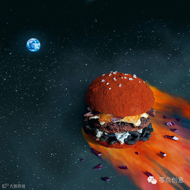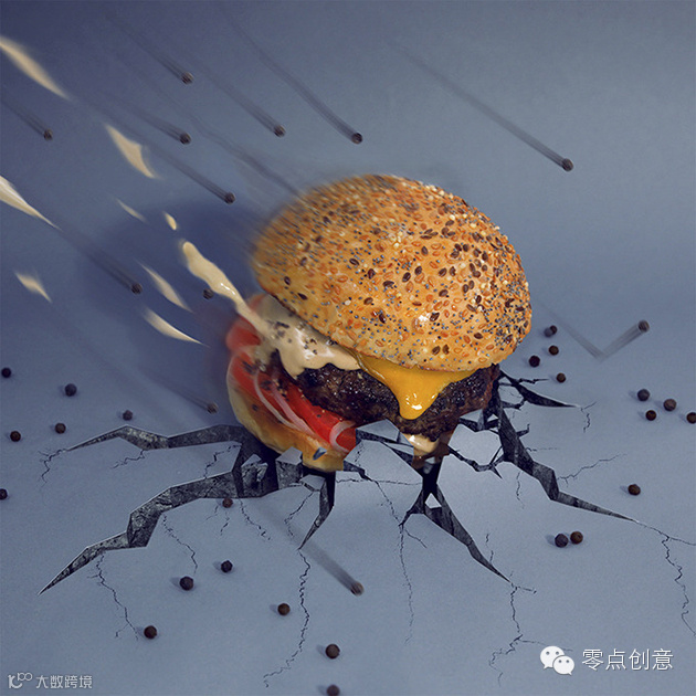 喷洒出来的美乃滋加上巧妙运用胡椒碎粒代替陨石块,看起来就像一场汉堡浩劫!