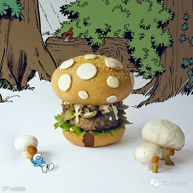 用切片的蘑菇当作磨菇汉堡,汉堡面包上下层也座大小及椭圆状的区分!