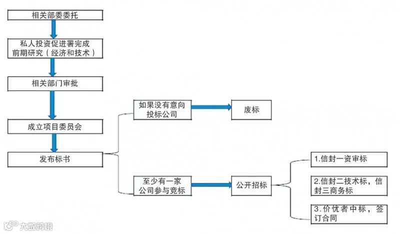 秘鲁联合融资类特许经营项目一般要经过多部委联合审批,涉及的部门一般有秘鲁私人投资促进署、经济财政部、项目相关部委、国家监管部门等。其一般开发流程如下图所示。