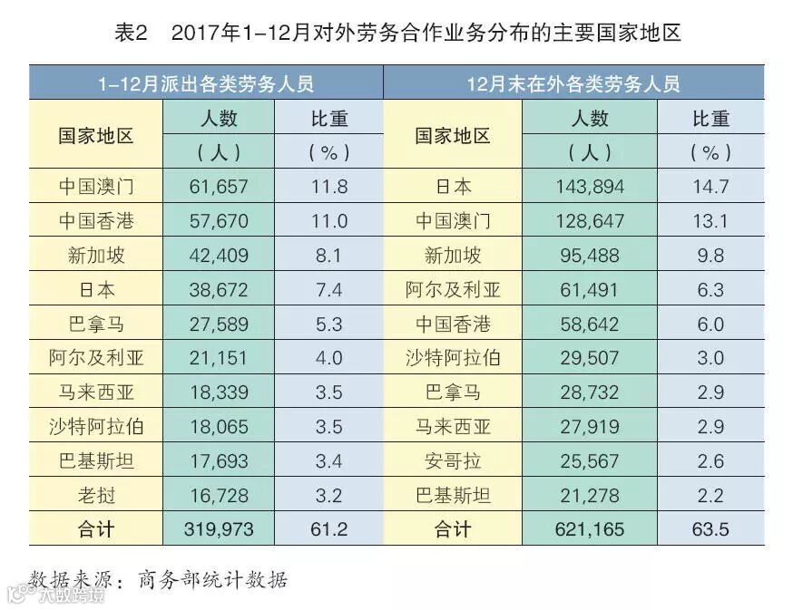 2017年澳门地区新签劳务人员合同工资总额10.74亿美元,相比2016年的11.81亿美元有一定幅度的下降;劳务人员实际收入总额12.40亿美元,派遣各类劳务人员61,657人,相比2016年的69,717人减少8,060人。期末在澳128,647人,相比2016年的122,636人,增加6,011人。占我在外人员总规模的13.1%,仅次于日本位居第二。