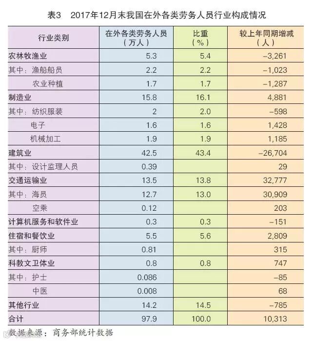 建筑业、制造业和交通运输业三大主要行业合计人数达71.8万人,所占比重由2016年的72.8%上升为73.3%。其中建筑业在外人数42.5万人,虽同比下降2.7万人,但占比仍达43.4%;制造业15.3万人,同比增加0.5万人,占比为16.1%;交通运输业13.5万人,同比增加3.3万人,占比13.8%。其中海员增加3.1万人,增幅由上年的9.9%上升为13%。
