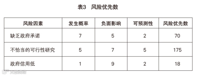 在识别主要风险因素后,对其进行定量分析,综合考虑风险因素的发生概率、负面影响程度、可预测性这三项指标,运用层次分析法及失效模式和效果分析法得出风险优先数,排列风险因素的顺序,找出核心风险因素。