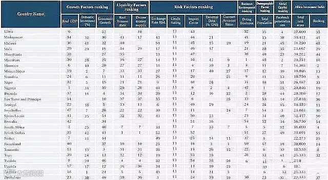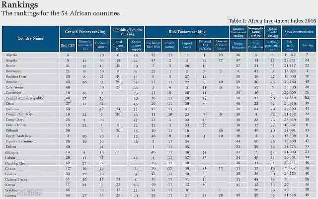 在2016年非洲投资指数榜单上,博茨瓦纳排名第一,摩洛哥因其持续稳定增长的经济、优越的地理位置、增长的外国直接投资、进口额比率及整体有利的营商环境而位居该指数的第二位。埃及因外国直接投资和实际利率增加以及城市人口不断增长而位居指数第三位。排名第四位的是南非,南非由于GDP增长率、国内良好的营商环境及庞大的人口而获得较高评分。与此同时,赞比亚因其重大的国内投资和充足的货币供应而位居指数第五位。此外,坦桑尼亚位列第8,是东非地区唯一上榜的国家。