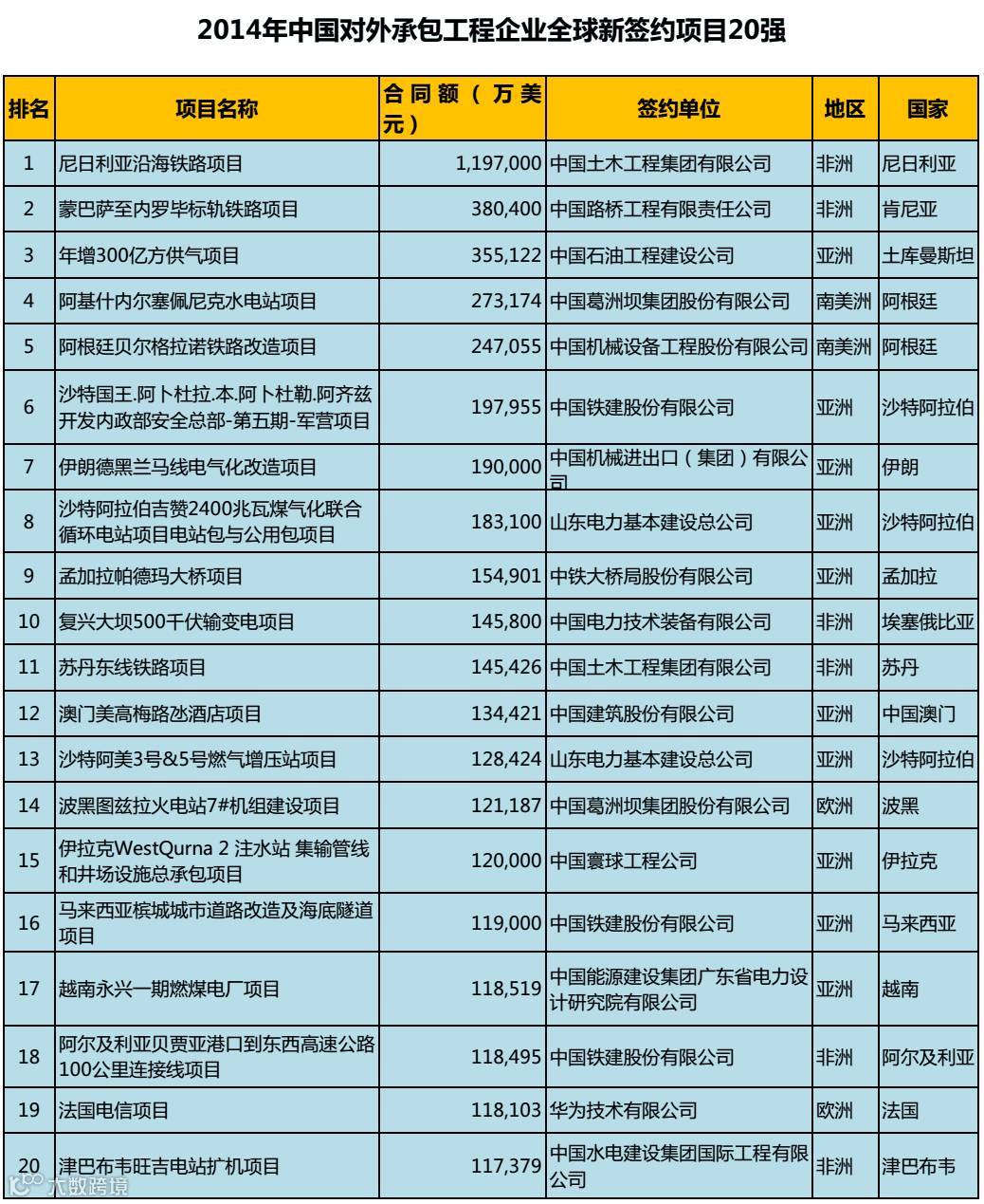 2014年,在外部形势总体严峻的情况下,中国对外承包工程业务市场覆盖面进一步拓宽,不仅亚洲和非洲两个主要市场业务发展较好,在欧洲、拉美市场方面也取得了积极进展,均有不同数量的大型国际工程项目签约。从中企2014年全球新签约项目20强的区域分布来看,在亚洲地区有10个项目,非洲地区有6个,南美地区有2个,中东欧地区有2个。其中最突出的是中国土木工程集团有限公司在非洲新签约的尼日利亚沿海铁路项目,合同额接近120亿美元。