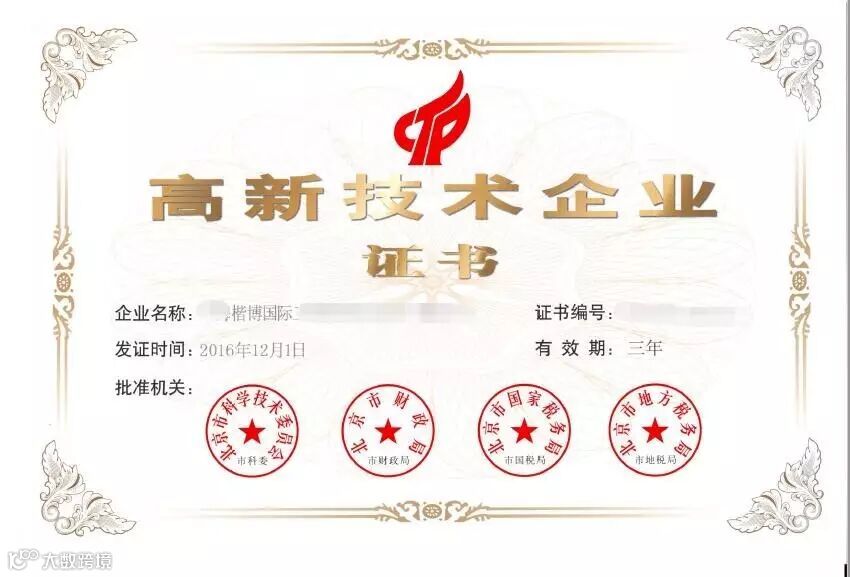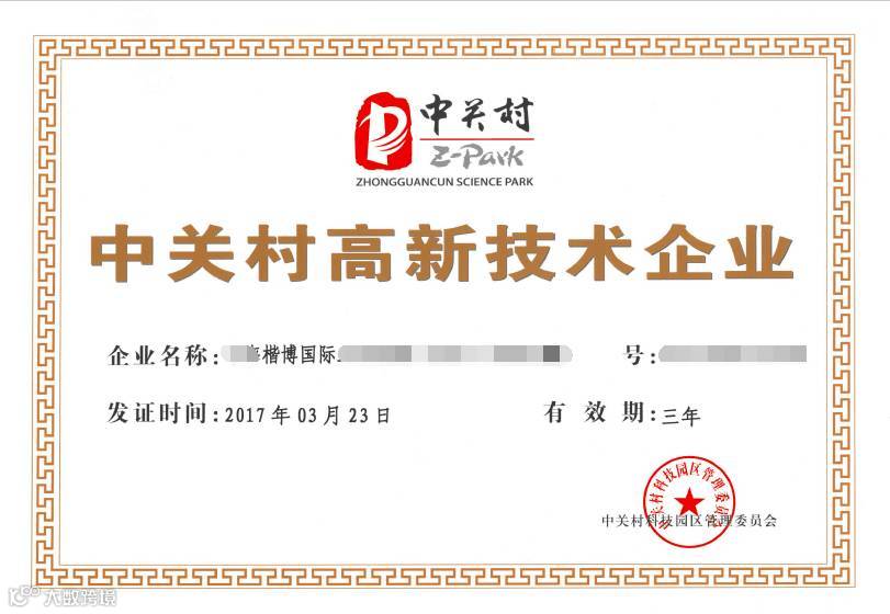 楷博国际于2016年12月获得了由北京市科学技术委员会、北京市财政厅、北京市国家税务局、北京市地方税务局联合颁发的《高新技术企业证书》,并于2017年3月获得了由中关村科技园区管理委员会颁发的《中关村高新技术企业证书》。