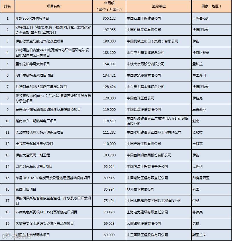 2014年中国企业在亚洲市场签约额在10亿美元以上的项目有13个,多为所在国政府资金项目,不少项目代表了中国企业在此领域的较高水平。例如,孟加拉帕德玛大桥项目为中国企业在境外承揽的最大国际桥梁项目,也是同类桥梁中基础施工难度最大的项目;澳门美高梅路氹酒店项目是大型酒店中精装修及机电设备安装要求极高的工程项目。2014年中国企业在亚洲市场新签约金额前20位的项目如下。