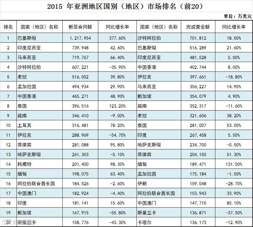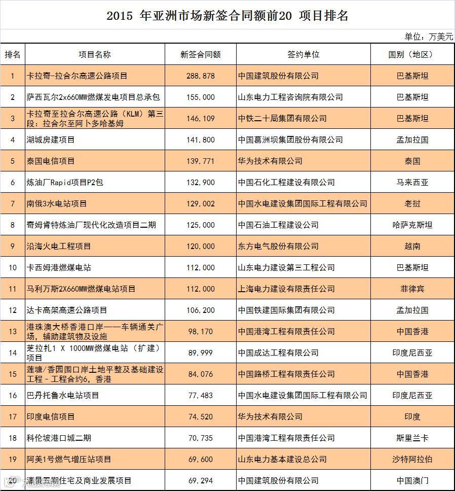 2015 年中国企业在亚洲市场新签合同额在10亿美元以上的项目有12 个。2015 年亚洲市场新签合同额排名前20 位项目见下表: