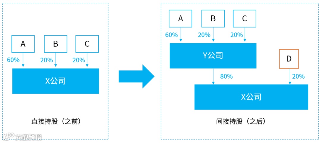 A:我们可以考虑在X公司上面搭建一个Y公司,创始人控制Y公司,Y公司再控制X公司。如下图,A拥有Y公司60%股份,有相对控制权,而Y公司拥有X公司80%股份,控制X公司。虽然分了20%股份给D, 但A仍可以通过间接持股来控制X公司。
