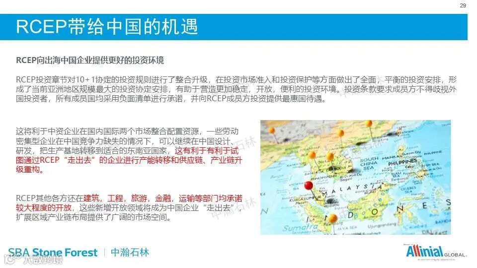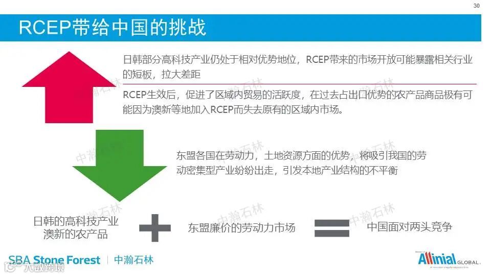 RCEP对中国而言,机遇与挑战并存。一方面,RCEP将带来推动贸易投资自由与便利化,显着下降交易成本等机遇。另一方面,中国也将面临日韩高科技产业、澳新农产品以及东盟廉价的劳动力市场带来的挑战。