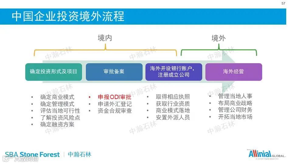 中国企业投资境外涉及到确定投资形式及项目、审批备案、海外开设银行账户、注册成立公司、海外经营等流程。中瀚石林作为专业的跨境投资解决方案供应商,将协助企业扎实走好跨境投资的每一步。