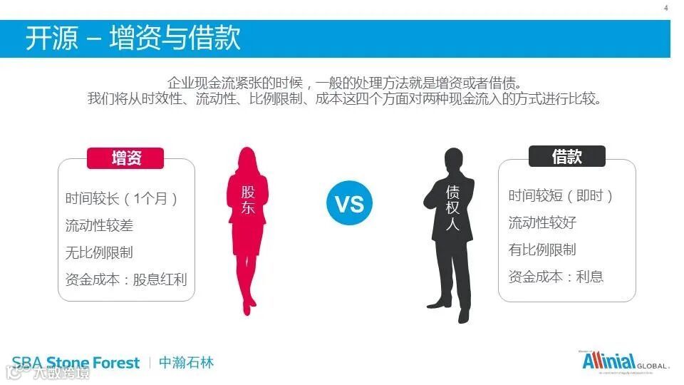 简单来说,就是增资或者借债。我们对这两种现金流入形式从时效性、流动性、比例限制、从资金成本角度是否优选做了一个比较。