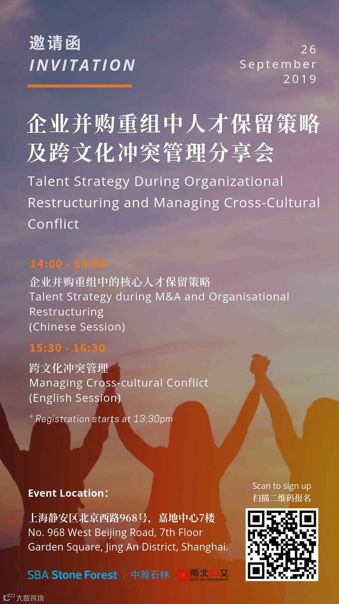 9月26日,中瀚石林将携手南北中文在上海静安区嘉地中心举办《企业并购重组中的核心人才保留策略及跨文化冲突管理》分享会。我们诚邀相关人士与我们一同探索当今跨文化环境下的人才管理策略及洞察。