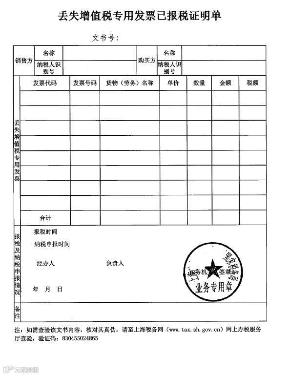 一般纳税人丢失已开具专用发票的,销售方可以申请开具已抄报税证明。按规定,公司需要带好税务登记证及开具的专用发票记账联复印件盖公章送交所属税务局办税大厅。只要提交的资料齐全,符合法定形式并完整填写所需申请表格,一般情况下只需一个工作日就会收到税务机关的受理回执。下图为证明单样本: