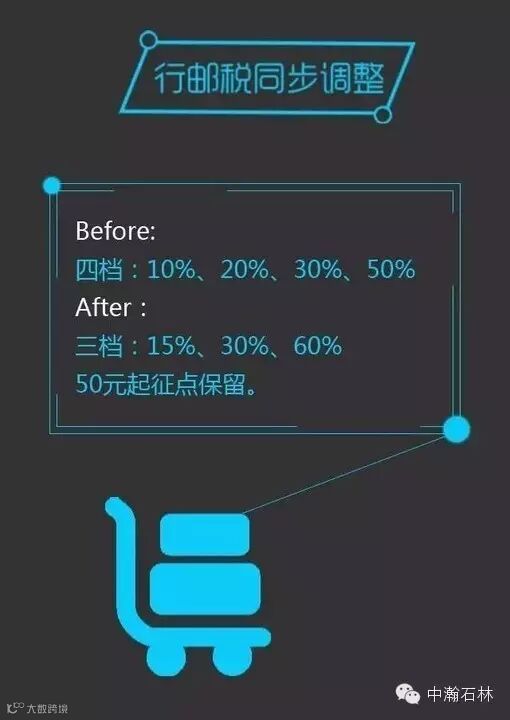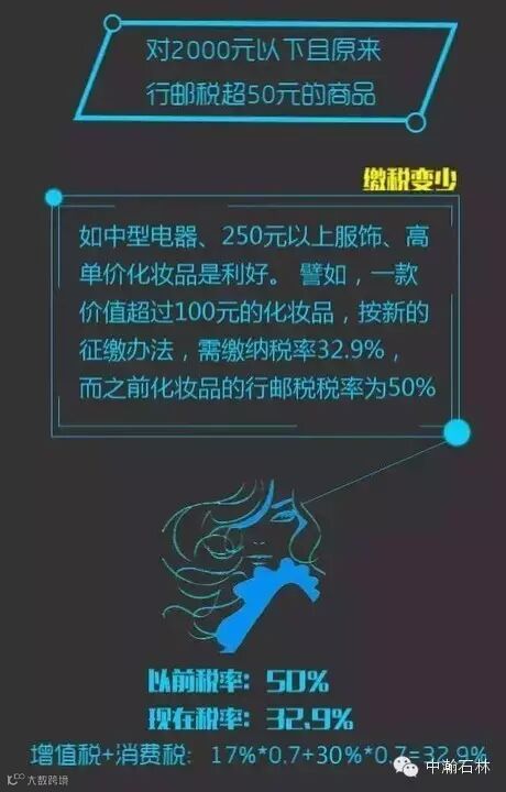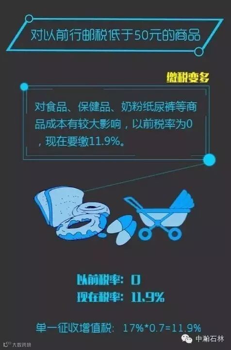 “这样看起来税收没有太大变化啊?”你可能会问。重点在这里,除了行邮税以外,此次新的税收政策其实是要对跨境电子商务零售进口商品增加“跨境电商综合税”,包括增值税和消费税,并且没有任何免征额。虽然以应征税额的70%征收,也就是说算出增值税和消费税的总额后,打七折收取。