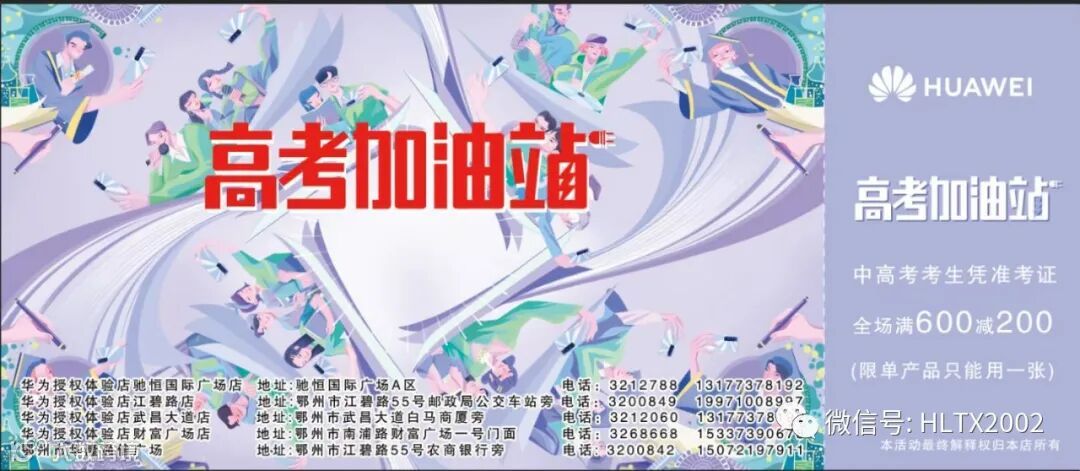 6月9日上午9:00即将在华为授权体验店驰恒国际广场店、华为授权店武昌大道店同步举办“圆梦高考,华为助你金榜题名”户外活动,优惠多多,欢迎选购!