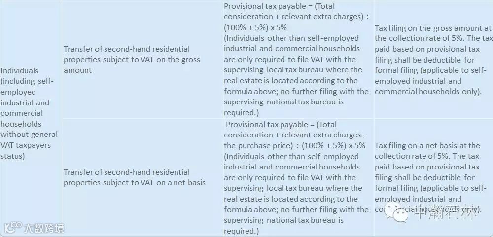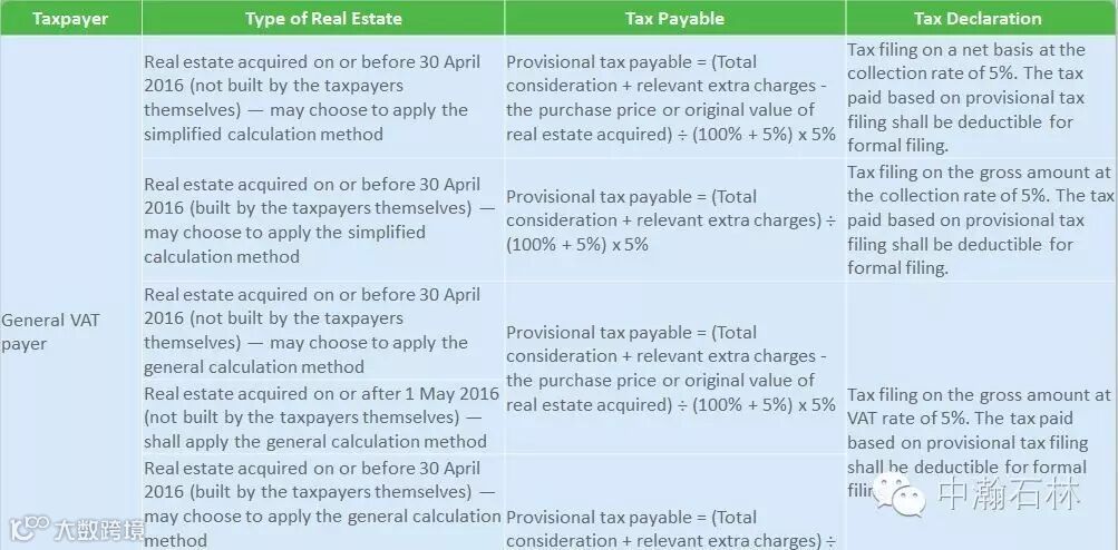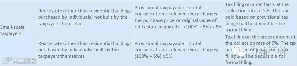 On 31 March 2016, the State Administration of Taxation announced interim administrative measures for the collection of real estate value added tax (VAT) from taxpayers. These measures have been in effect since 1 May 2016 and are described in the table below.