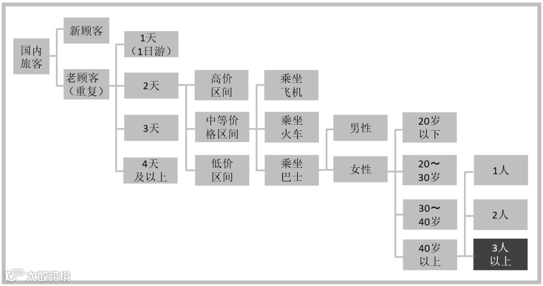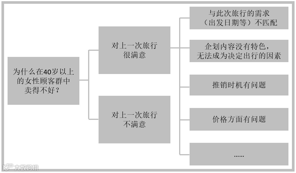 那么,在确定了问题点之后,我们就可以去思考为什么这个地方会出现问题,建立假说。可能是因为对上一次的旅行感到不满?那么就从对上一次旅行的满意与否开始分解。具体的做法可以参考下图。