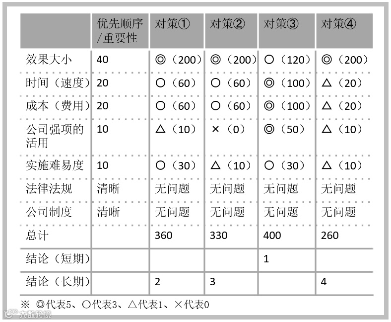 在有了几个对策的备选方案之后,我们就要思考最终要使用怎样的判断标准来选择对策、决定执行的顺序。