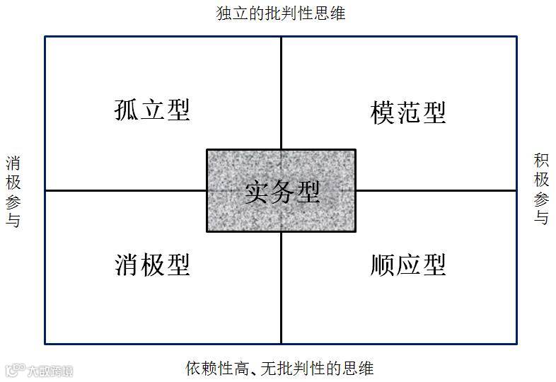 对追随力的研究也能分成若干个领域,其中最著名的莫过于罗伯特·凯利(Robert Kelly)进行的分类。他以“独立健全的批判性思维的水平”和“参与的积极性”为横轴和纵轴,搭建了矩阵,并将在这两方面表现优异的追随者定义为“模范型追随者”。