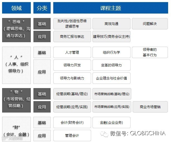 顾彼思认为,“人”,“物”,“财”是全球化企业经营、人才培养的三大要素,而这三大要素要想发挥其最大效能,需要依托于“思维模式”及“思维习惯”的力量。因此,我们的课程体系基于以上理论涵盖以下四个领域: