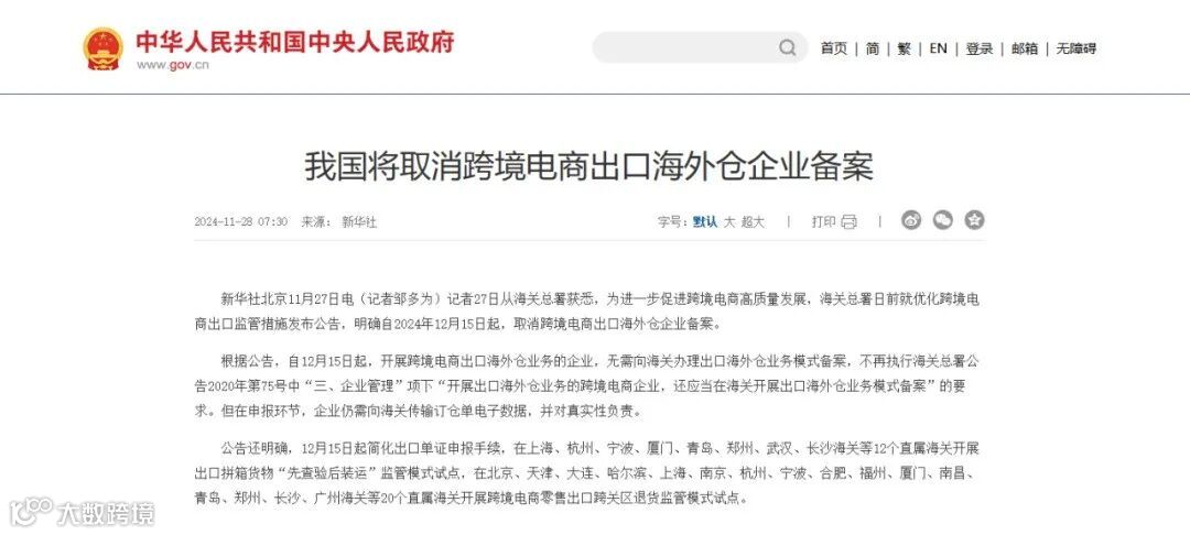 中国海关总署近期正式不再要求跨境电商出口海外仓企业进行备案。