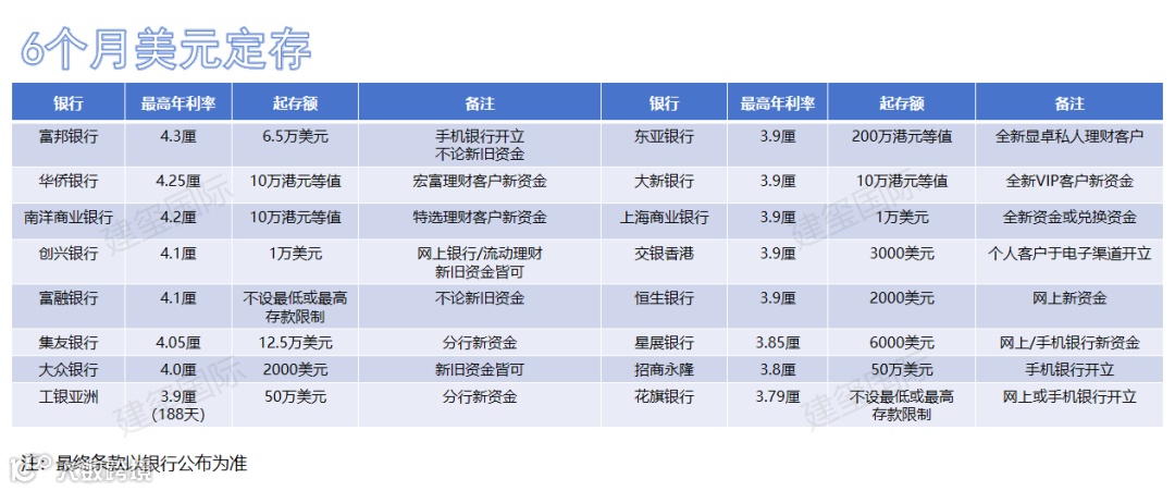 富邦银行也不含糊,1个月美元定存利率为5.98厘,只是起存金额要求是10万港元等值,这对有一定资金且追求稳健收益的投资者来说,是个可选的方向。