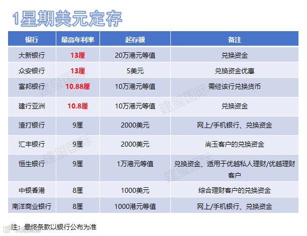 大新银行美元1周定期存款利率最高达13厘,不过起存金额为20万港元等值。