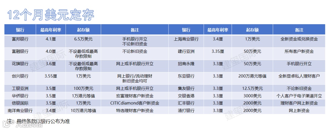 富邦银行在1年期美元定存业务上保持领先,给出4.1厘的定存利率。
