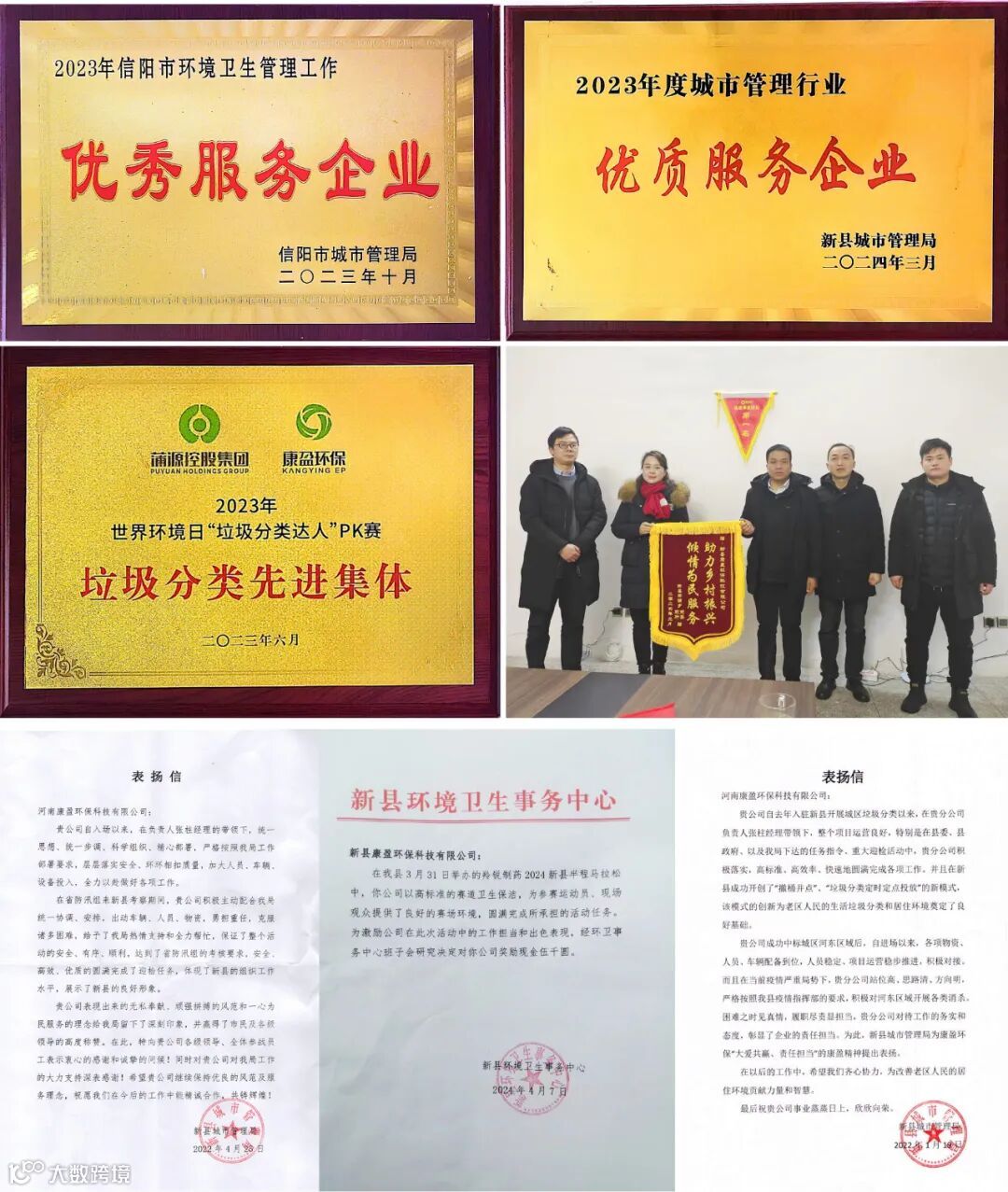 近年来,新县项目部多次受到上级部门嘉奖与赞誉,荣获2023年信阳市“优秀服务企业”、2024年新县“优质服务企业”等荣誉称号。含“赞”量满满的表扬信和锦旗,是新县项目部交出的满意答卷,更是上级领导和广大市民群众对康盈环保的满分信任。
