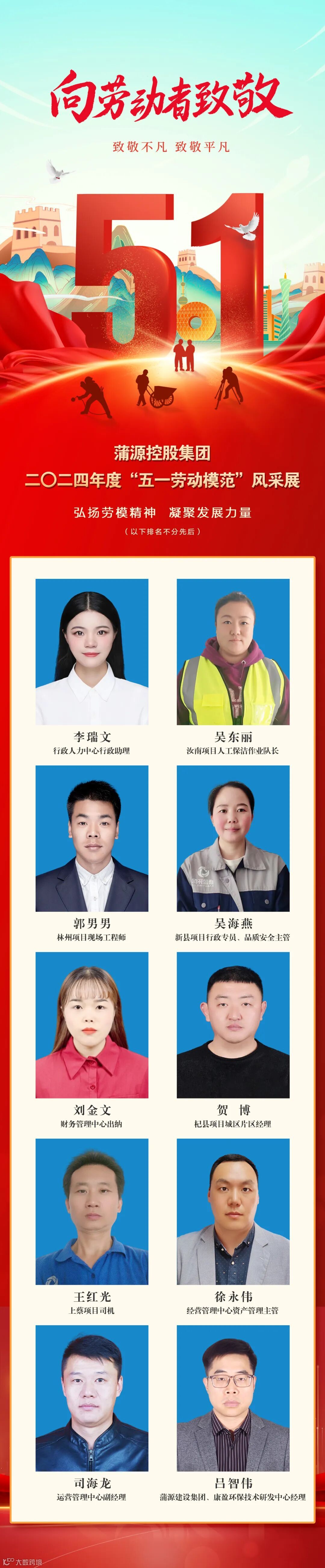 奋进新征程,建功新时代。为进一步弘扬正气,表彰先进,激发广大职工“爱岗敬业、争创一流,艰苦奋斗、勇于创新,淡泊名利、甘于奉献”的劳模精神,形成“人人争当先进,人人争做劳模”的良好氛围,在“五一”国际劳动节到来之际,蒲源控股集团推选出一批先进模范代表,他们扎根在蒲源各个岗位,积极履职担当,用突出的业务能力,为蒲源赢得广泛赞誉。让我们一睹蒲源控股集团“五一劳动模范”风采,凝聚发展力量。