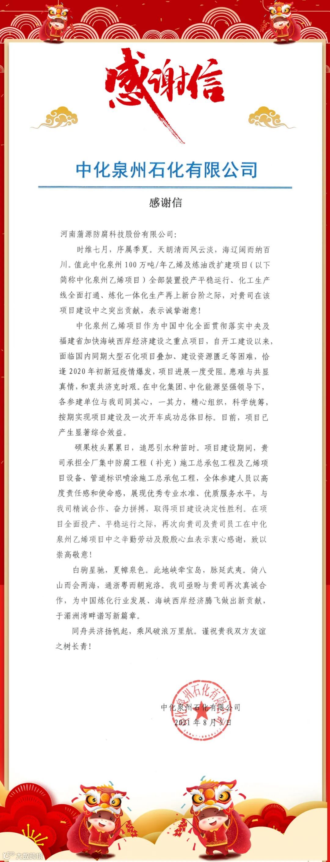 天朗清而风云淡,海辽阔而纳百川。值中化泉州100万吨/年乙烯及炼油改扩建项目全部装置投产平稳运行、化工生产线全面打通、炼化一体化生产再上新台阶之际,中化泉州石化有限公司给蒲源集团旗下子公司河南蒲源防腐科技股份有限公司发来感谢信,具体内容如下:
